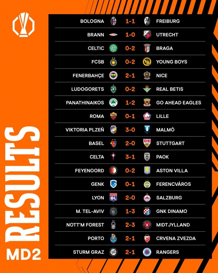 10月3日讯 欧联杯联赛阶段第二轮比赛战罢,罗马0-1不敌里尔,费内巴切2-1战胜尼斯,巴塞尔2-0击败斯图加特,费耶诺德0-2落败于维拉。